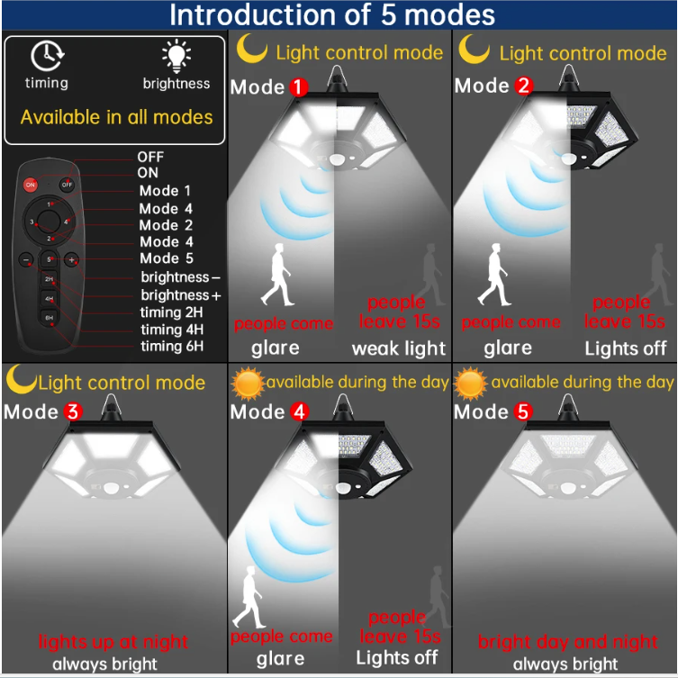 - लाईट मोड: मानवी शरीराचा सेन्सर + किंचित तेजस्वी मानवी शरीराचा सेन्सर + सामान्यपणे तेजस्वी मोड (चार मंदता २५%.५०%.७५%.१००% असू शकते)