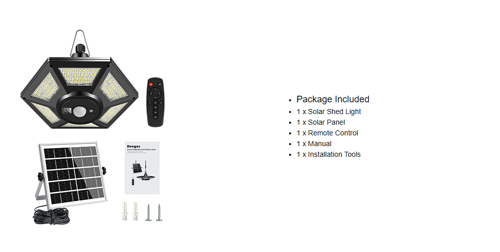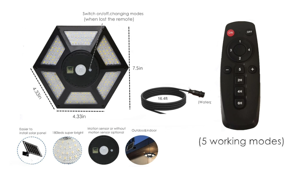 | समाविष्ट घटक | सोलर पॅनेल, रिमोट कंट्रोल, माउंटिंग हार्डवेअर, लाईट फिक्स्चर |